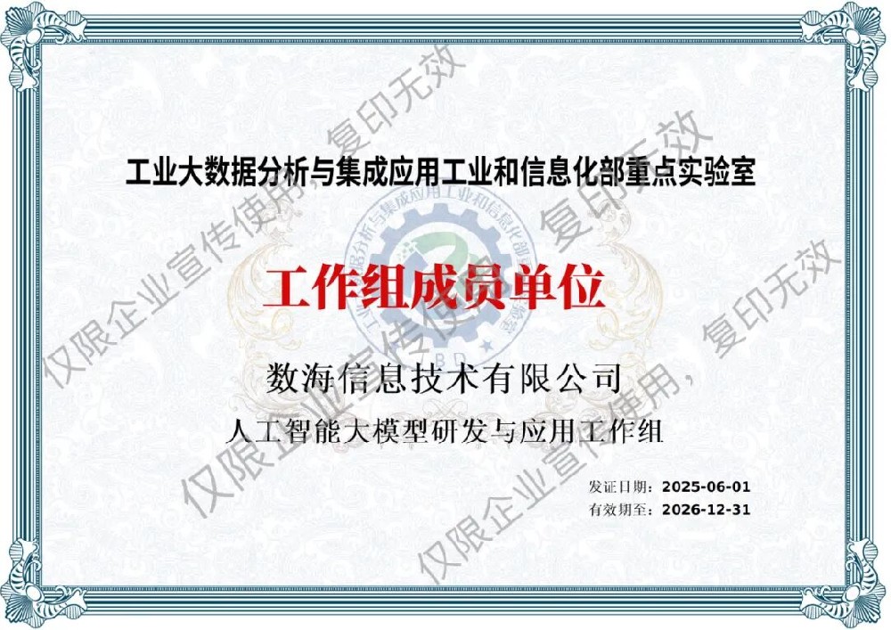 數(shù)海信息集團(tuán)入選工信部重點(diǎn)實(shí)驗(yàn)室人工智能大模型研發(fā)與應(yīng)用工作組,助力工業(yè)大數(shù)據(jù)創(chuàng)新與應(yīng)用??